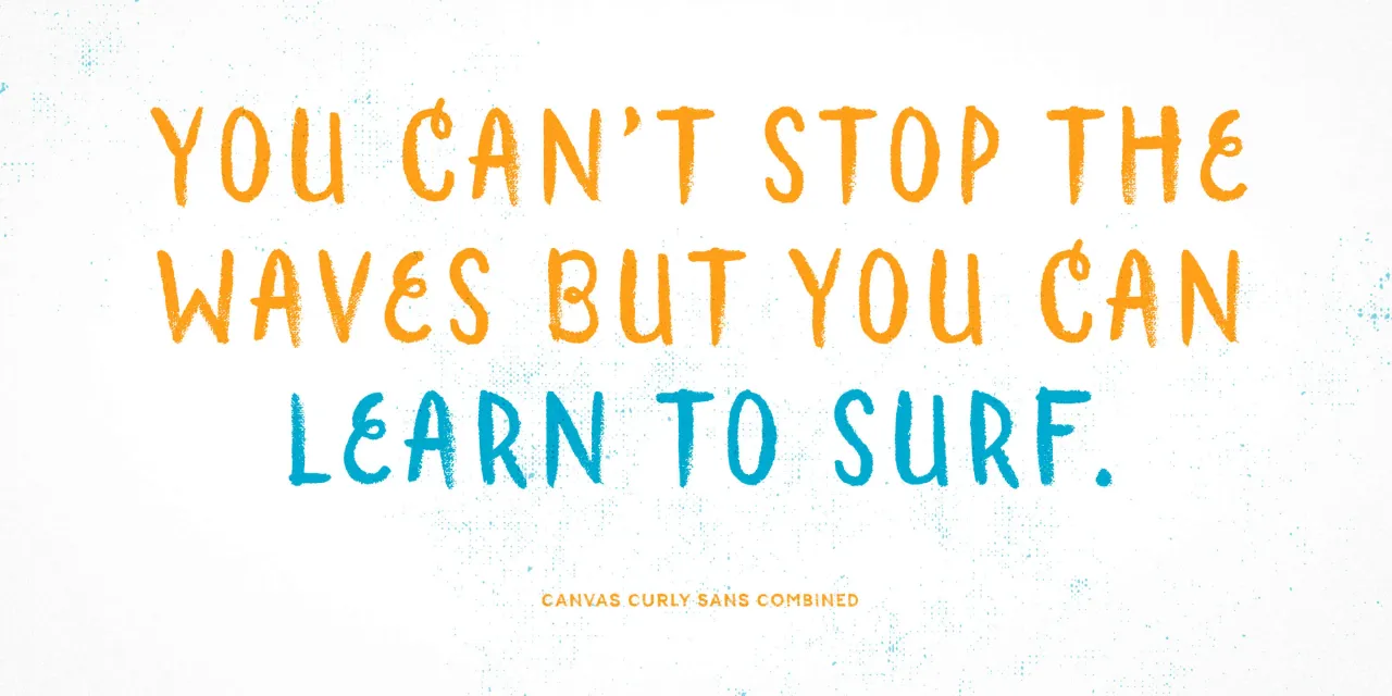 Canvas Curly Sans is part of the Canvas Acrylic Megafamily. It’s playful and sincere with unique layering options. With authentic, hi-res texture it retains its realism even at very large sizes. Canvas Curly Sans has double-letter ligatures that automatically fix adjacent duplicate letters. A bonus set of complimentary vector background textures, shapes and elements is available from the site.