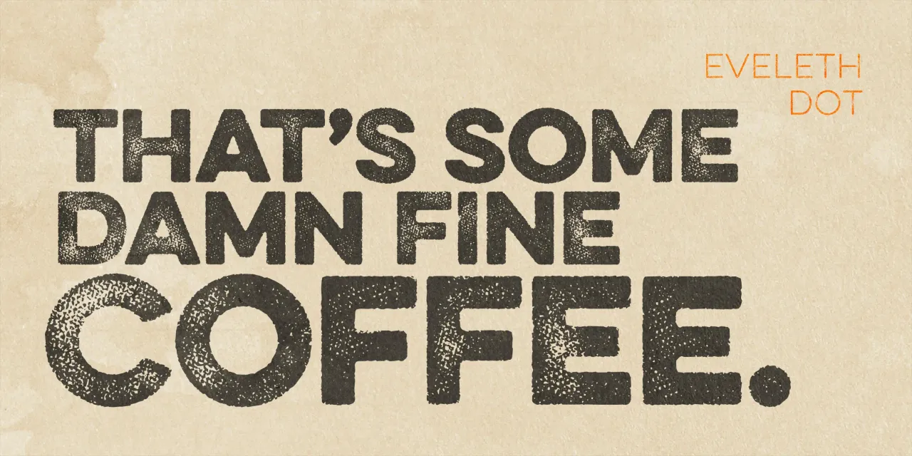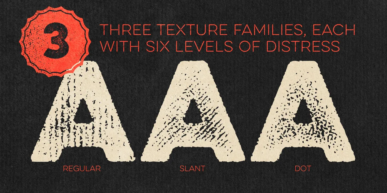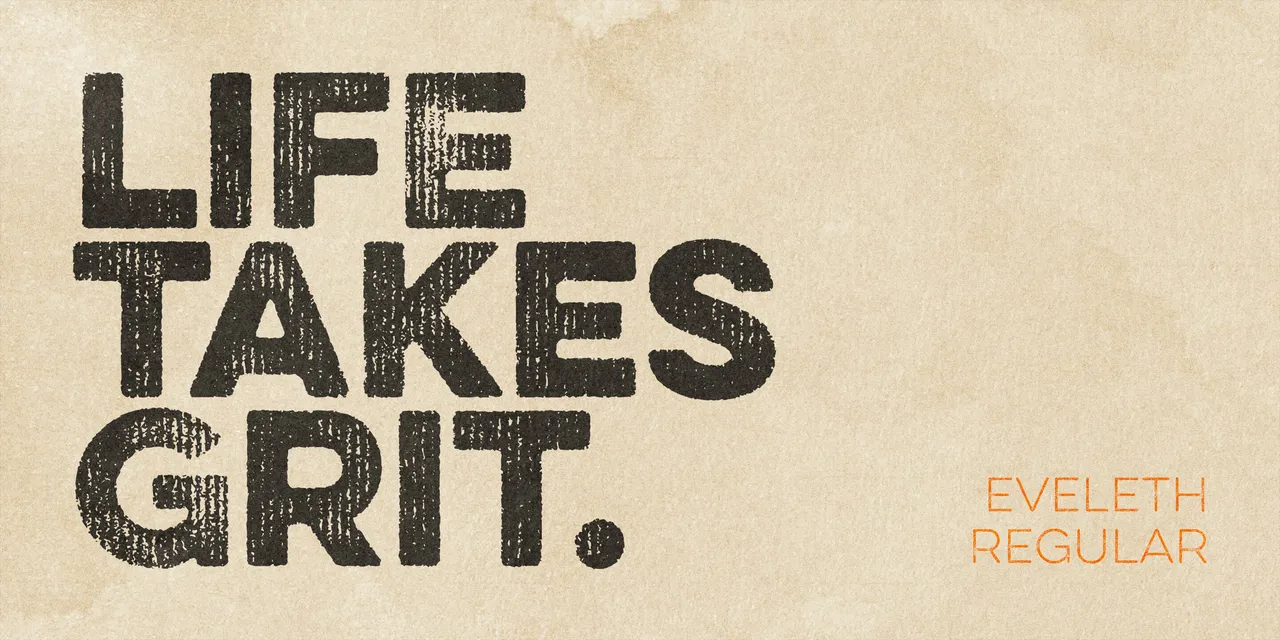 Eveleth from Yellow Design Studio is a premium high-resolution letterpress family with exceptional realism and vintage charm. It features 3 different sub-families each with its own unique printed texture. Each sub-family offers six distress options per letter and 3 options for all other characters allowing incredible control and customization. Bonus “spurs” have been included in every weight to add retro flair. Other features include a complimentary Thin weight, a shadow layer, a set of funky icons, a collection of useful shapes and emblems, and clean (non-distressed) versions.