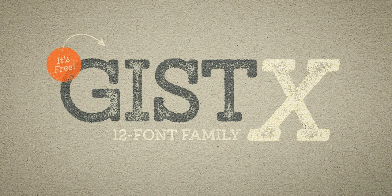 GistX is the solid, letterpress printed version of Gist inline slab. The family consists of 12 fonts total: Light, Regular and Bold (upright and slanted), each with two different distress versions. GistX is a unique marriage of monoline slab and indie script. It’s flourishy retro swag. The standard characters have the most traditional letterforms, while alternates add funk with swashes and script-inspired curves. The result is a unique modern slab with a vintage/retro vibe.