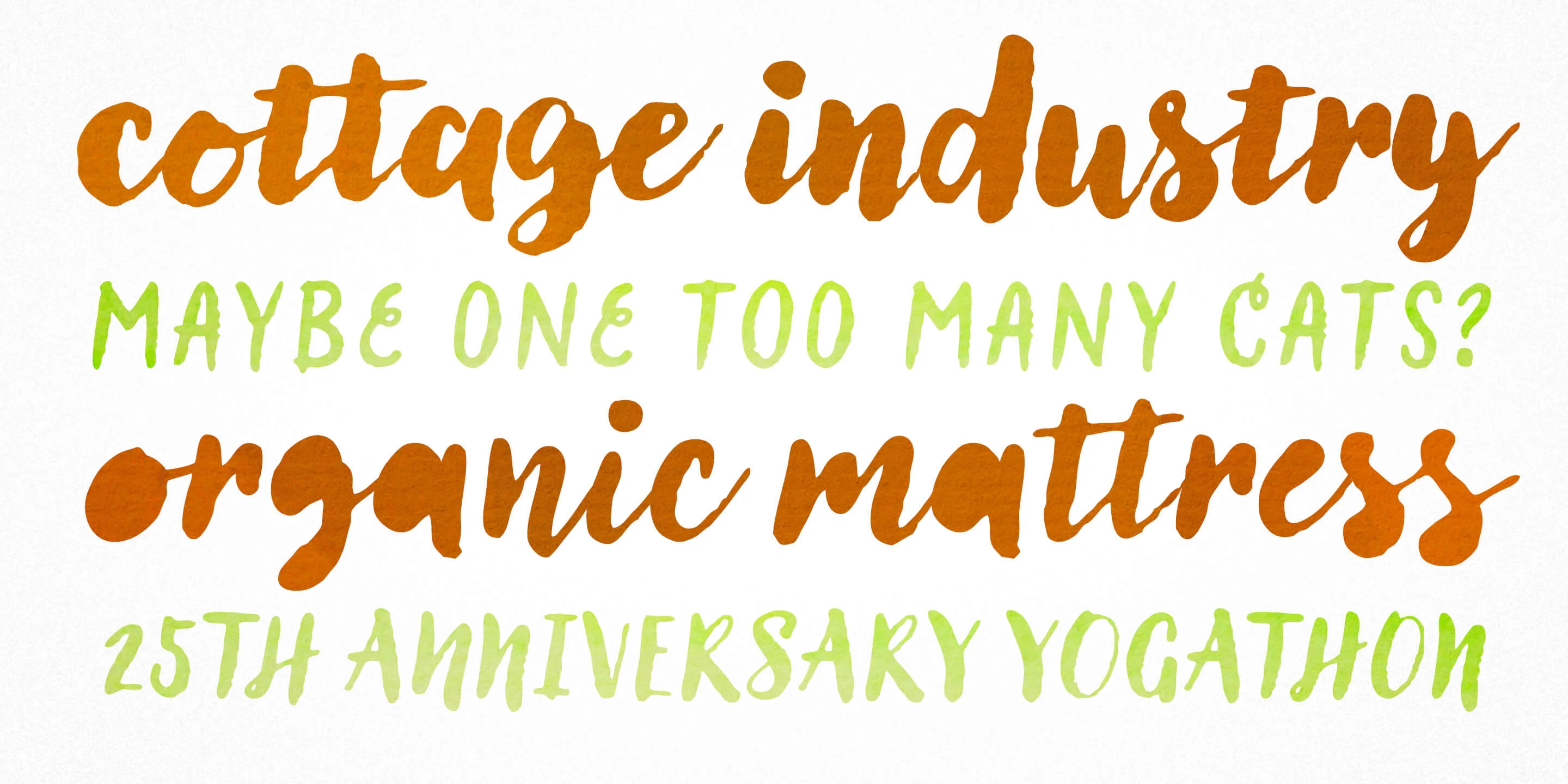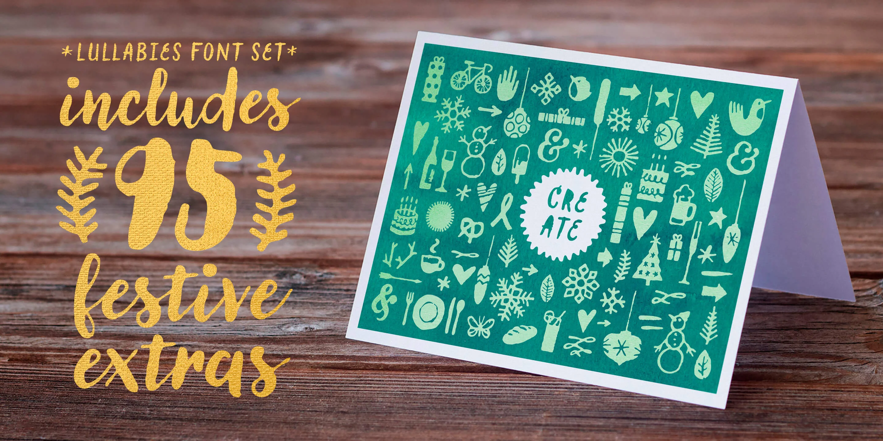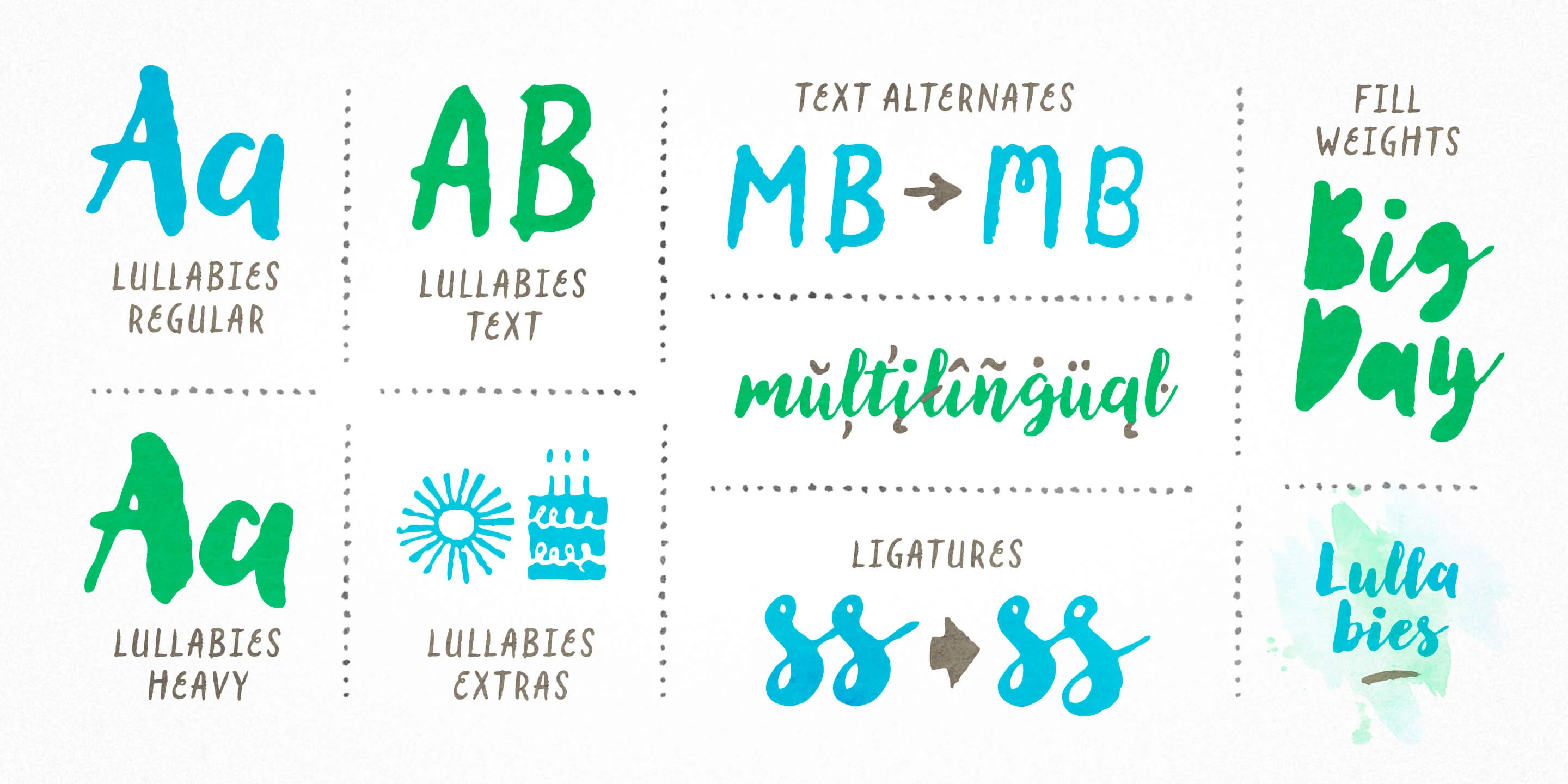 Lullabies from Yellow Design Studio is a warm-hearted brush font family featuring regular and heavy scripts plus a companion all-caps sans. Filled versions add extra playfulness. All weights include multiple options for every letter and number along with automatic double-letter ligatures for authentic hand-lettered typesettings. Also included is a set of 95 festive icons!