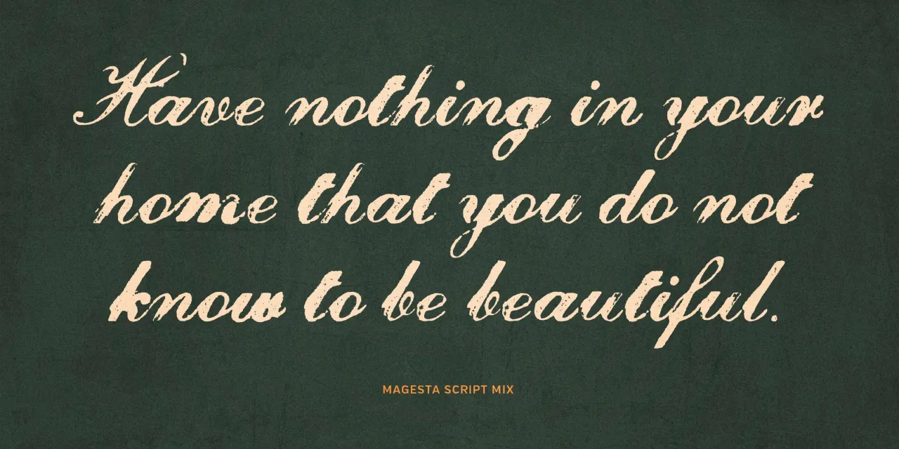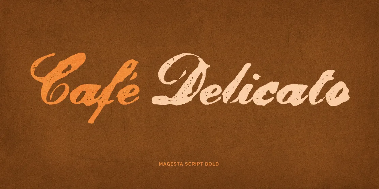 Magesta Script by Yellow Design Studio is a four-weight grungy take on early 20th century script that captures the authentic qualities of letterpress printing. Light, Regular, and Bold weights were created using different levels of ink coverage, while Mix is a combination of all three.