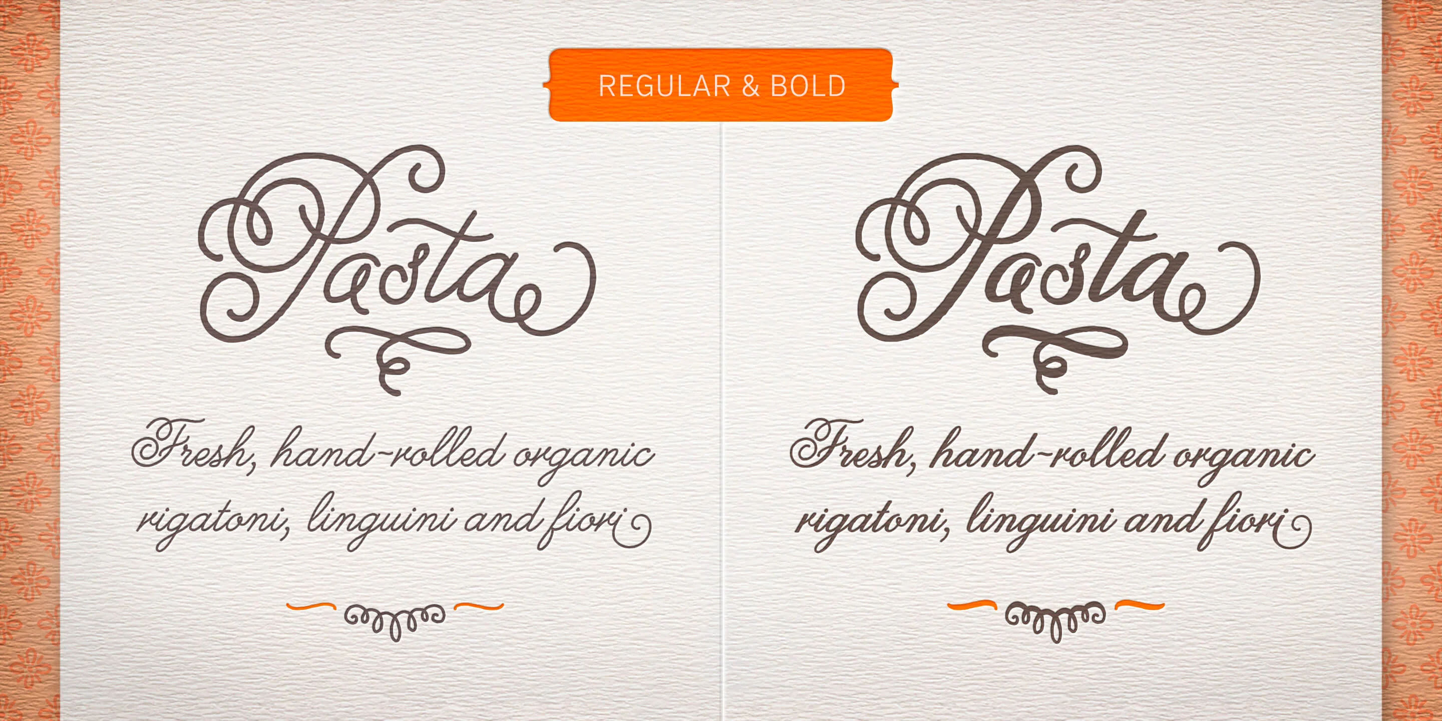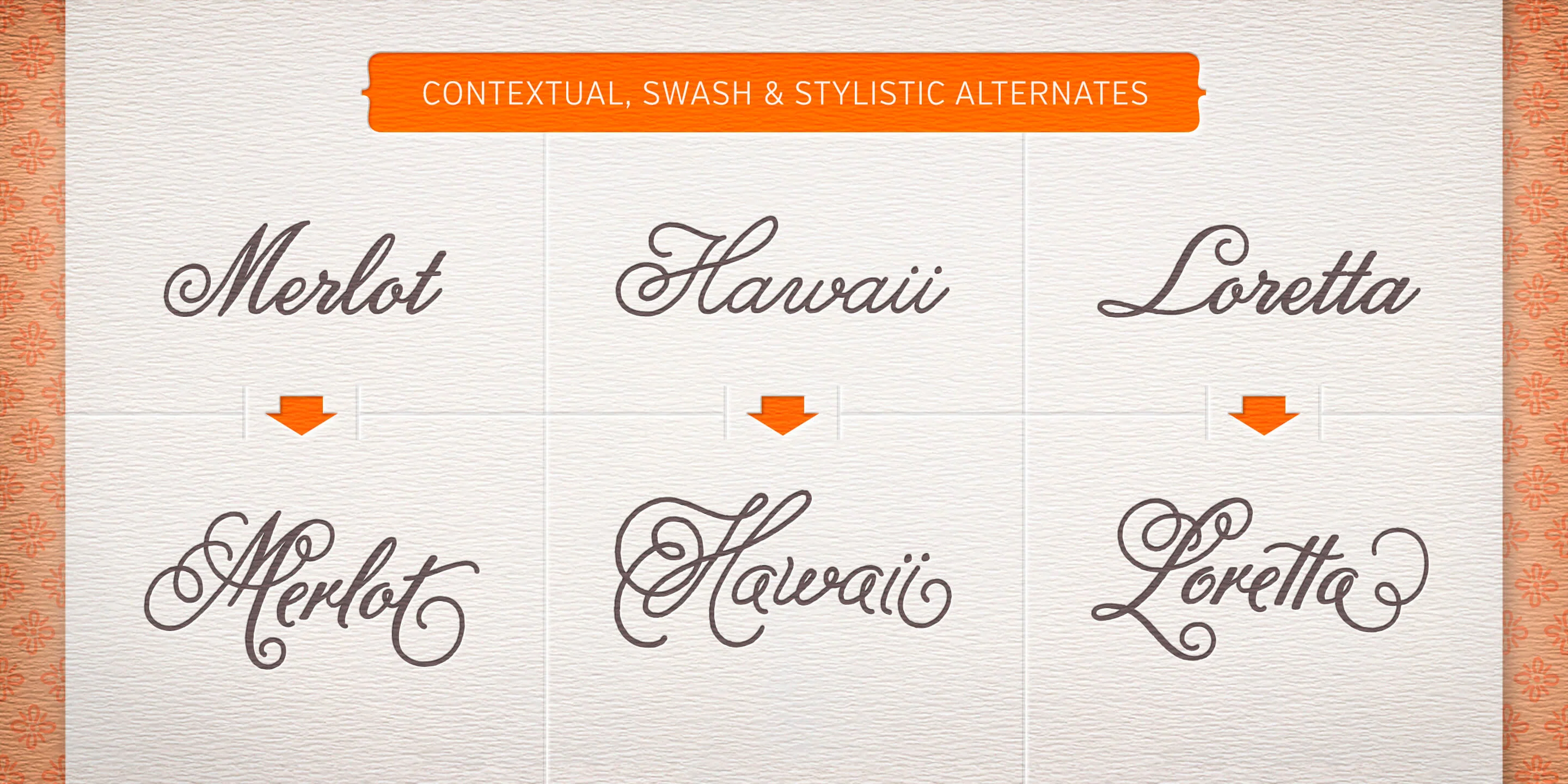 Melany Lane is a flourishy script based on traditional letterforms, but with the added quirks and warmth of hand-drawn type. The base character set has traditionally connected letters and an expressive charm. Contextual alternates add flair with unconnected letters and additional contour options. Mix in swash and stylistic alternates for extra funkiness and fun. Melany Lane features regular and bold, 118 eclectic ornaments, and a set of 14 seamless background patterns.
