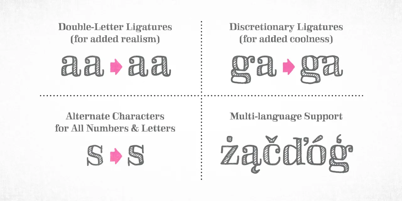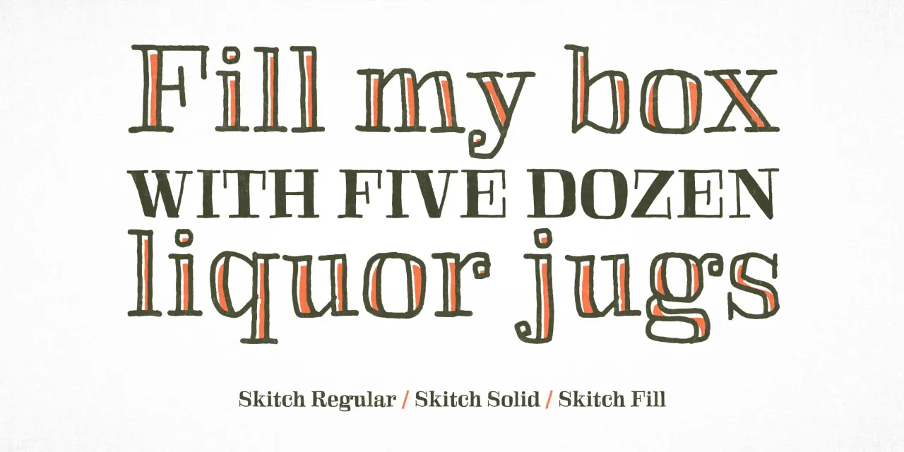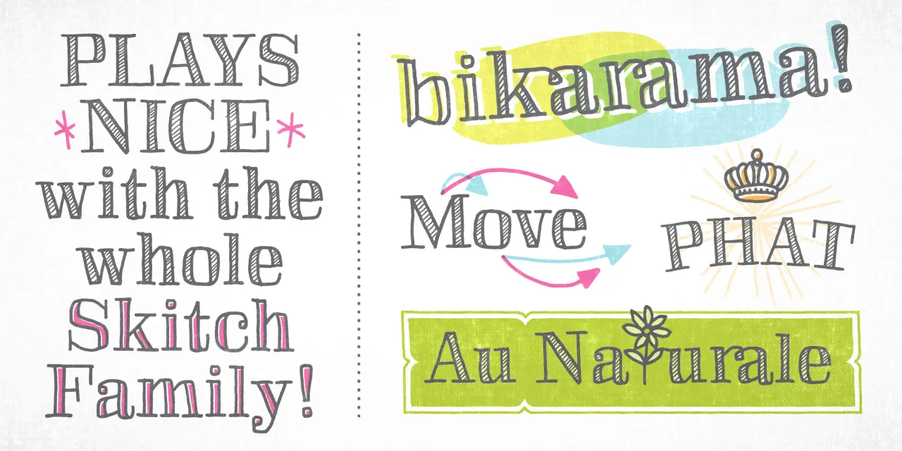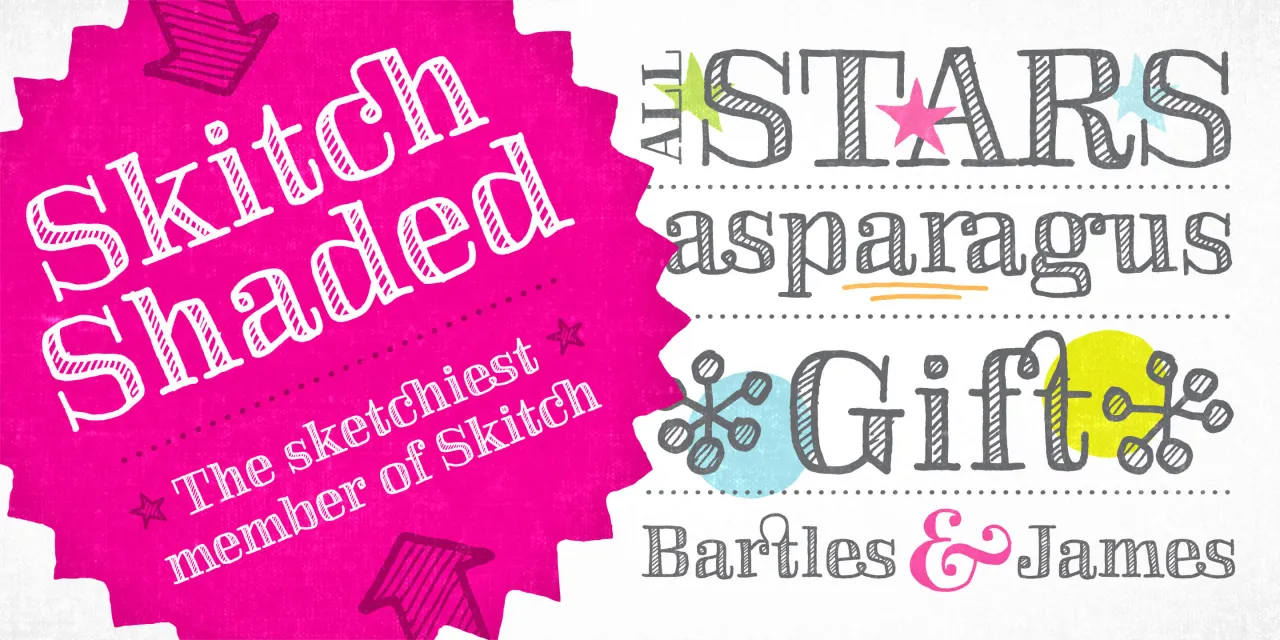 Skitch from Yellow Design Studio is a funky hand drawn serif with regular, solid, and fill options. It’s loaded with features including double-letter ligatures, discretionary ligatures and stylistic alternates, and is accompanied by an eccentric collection of ornaments and a set of expandable borders that can be mixed and matched for endless fun!