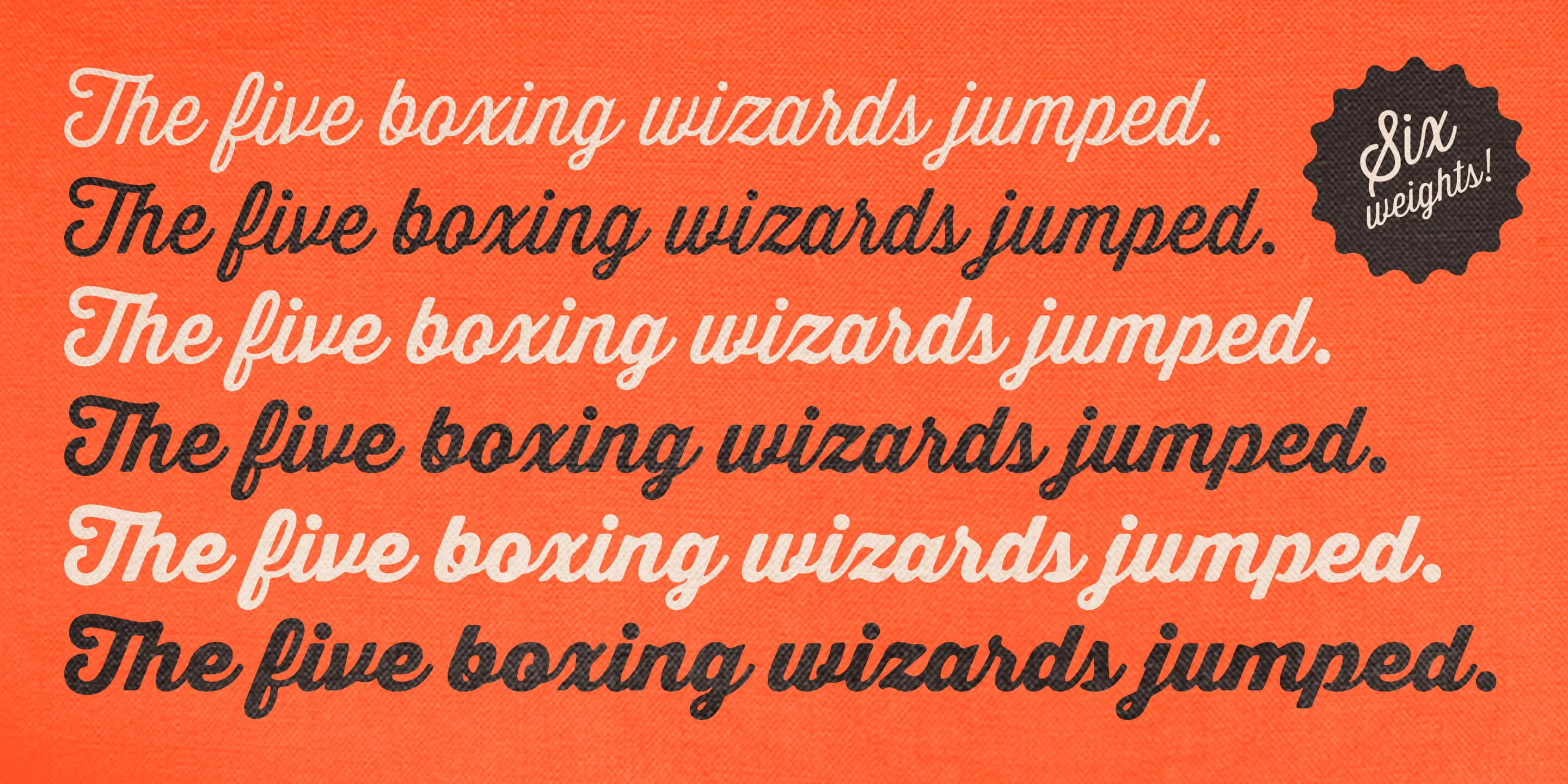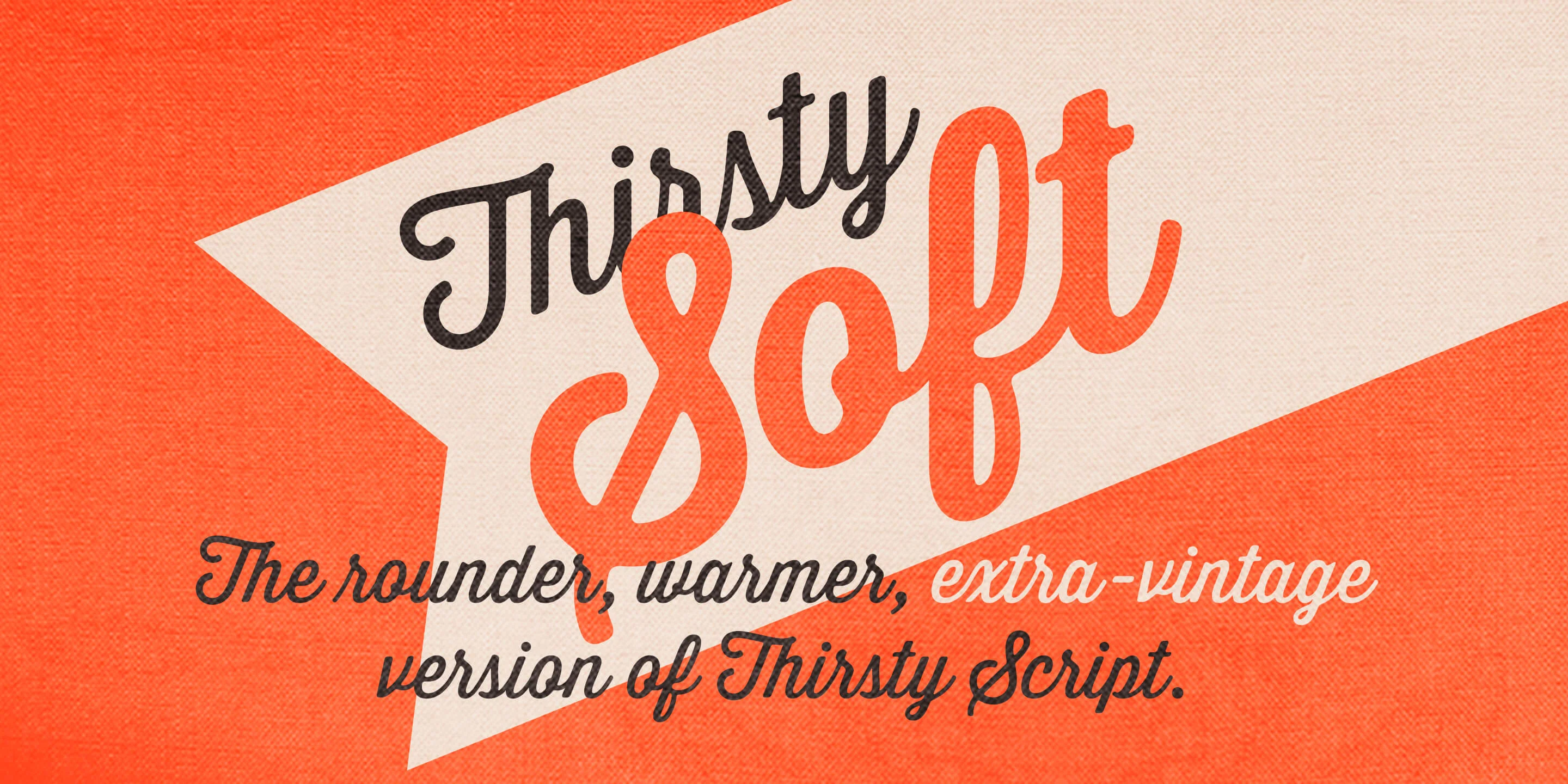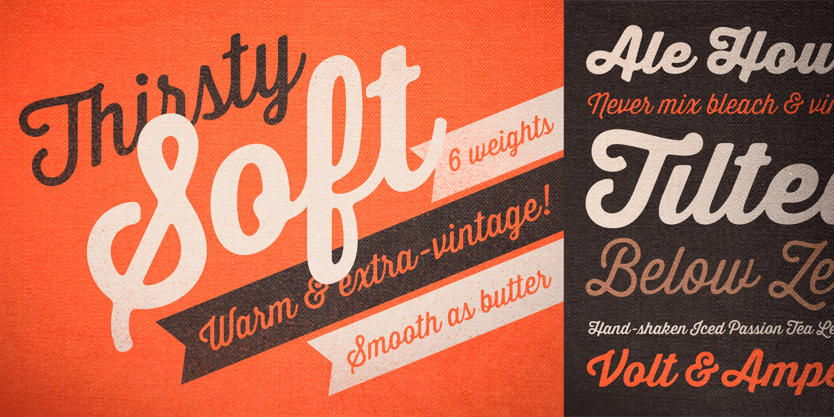 Thirsty Soft from Yellow Design Studio is the rounder, warmer, extra-vintage version of Thirsty Script. While the original Thirsty Script has a caffeinated demeanor with sharp edges and pointed terminals, Thirsty Soft is warm and buttery smooth, adding friendliness and an extra level of vintage appeal. Features include six weights from Light to Black, old-style figures, stem alternates, and a handy selection of ligatures and stylistic alternates.
