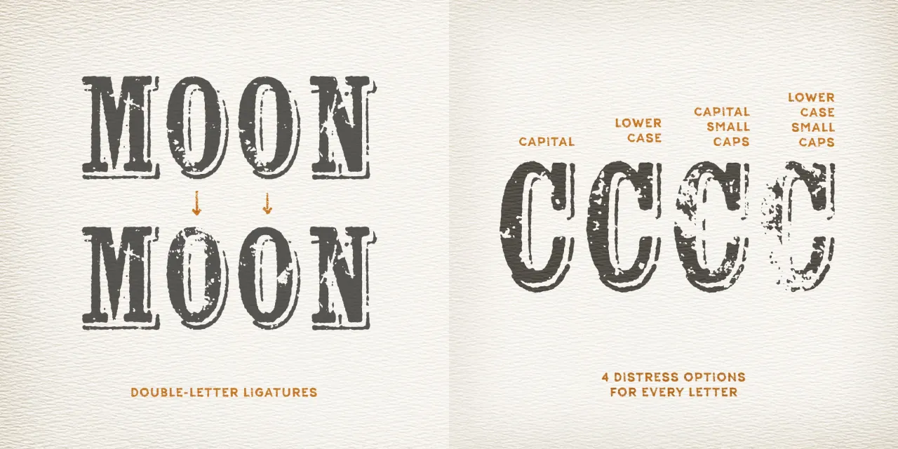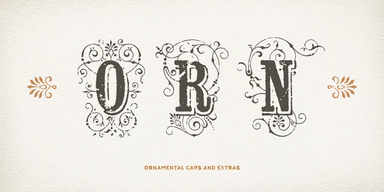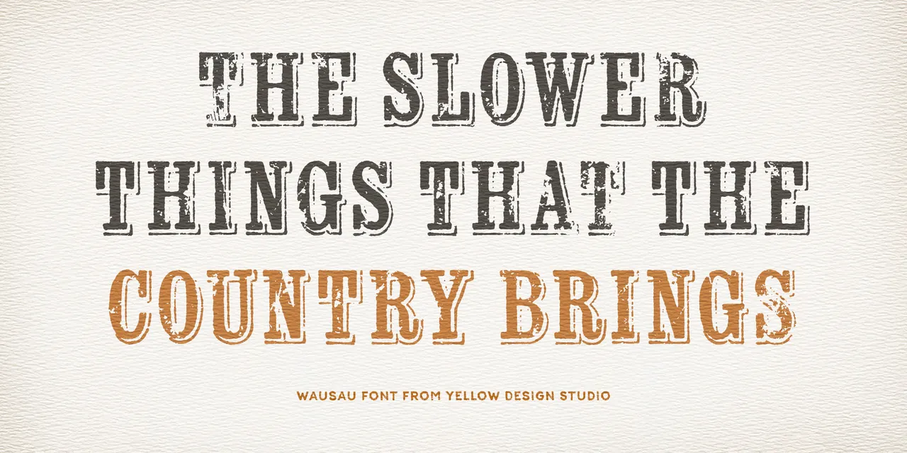Wausau is a distressed shadowed slab serif with a massive selection of alternate characters and ornaments. Features include a complete set of ornamental caps and double-letter ligatures to eliminate duplicate distressing in adjacent characters.